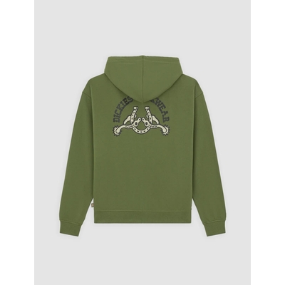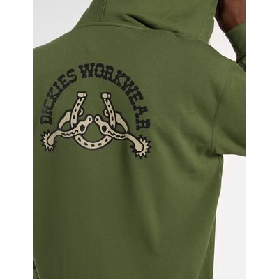 En polycoton French Terry 400 g/m² Capuche doublée avec cordon de serrage Ourlet et poignets côtelés Graphique d'éperons et de fer à cheval dans le dos Étiquette Dickies sur la couture latérale Poche kangourou Fermeture zippée Imprimé logo sur la poitrine
