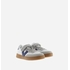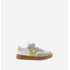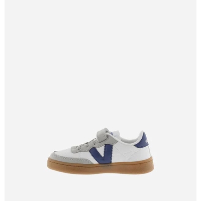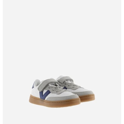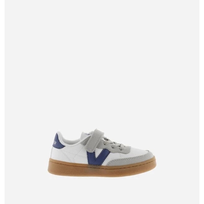 Baskets sport pour enfants fabriquées en effet cuir blanc avec pièces en effet daim. Détail de couleur sur la V victoria latérale, assorti à la pièce arrière, qui présente le logo de la marque gravé en blanc. Fermeture par lacet élastique, accompagné d'une bande auto-agrippante pour faciliter l'enfilage et assurer le maintien, favorisant l'autonomie. Semelle confortable en TPR couleur caramel.